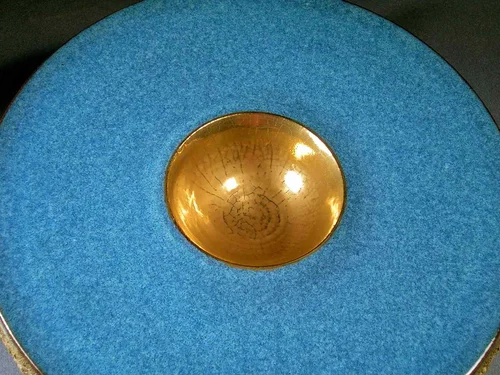 On the technical side: The Liquid Gold aka Fired Gold is a Gold Overglaze that, once it's fired is rated 23+ Karat. Gold is dissolved in an organic acid and suspended in a thick solvent based solution for ease of application by brush. Once the gold solution has completely dried on the piece it is placed in a ceramic kiln and fired to 1350 F degrees. The high temperature burns off the organic acid and solvent, leaving a layer of metallic gold on the bowl.